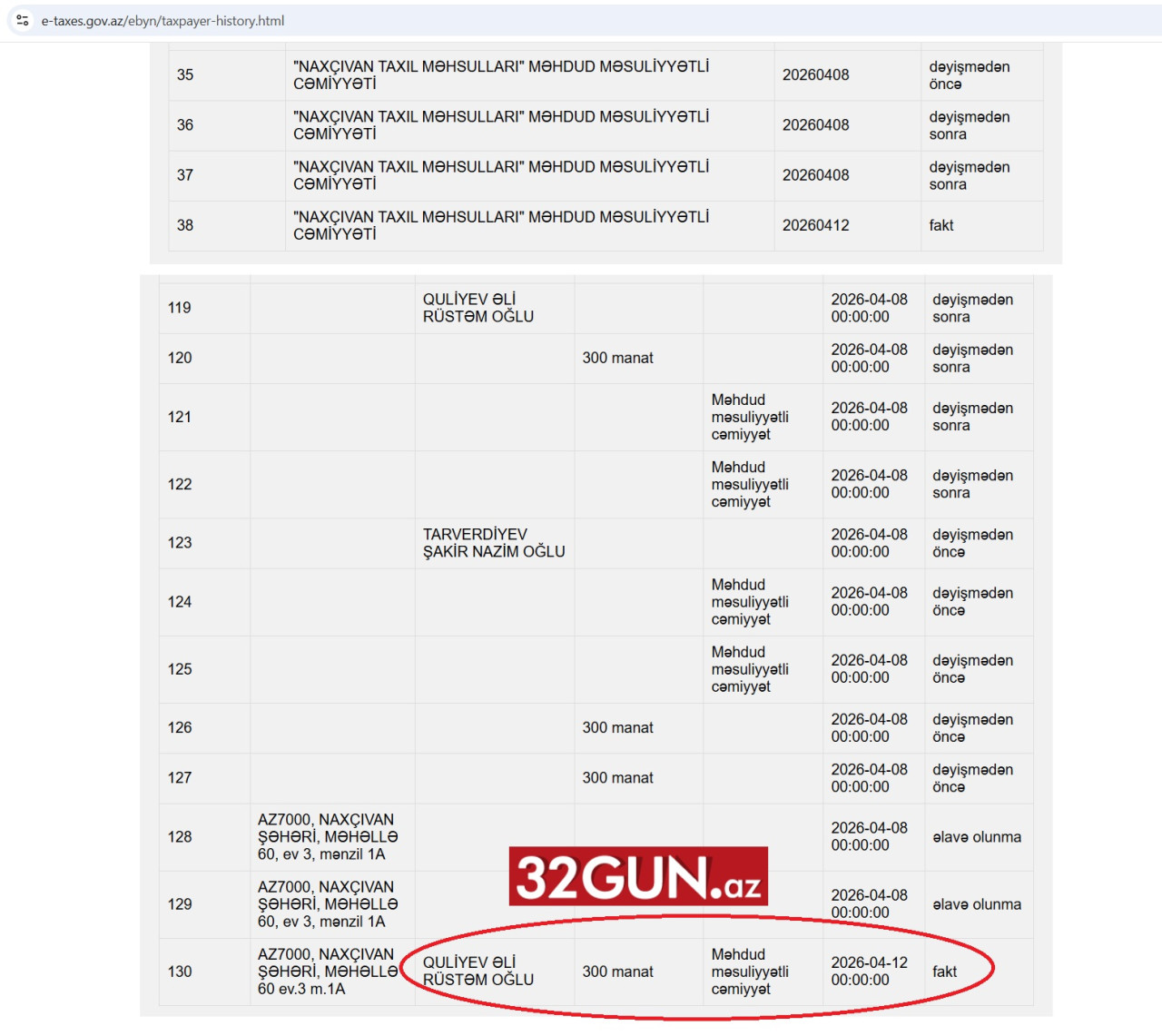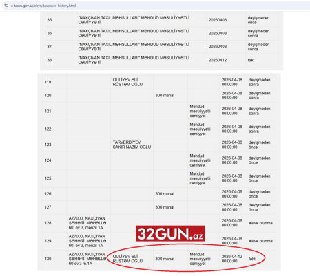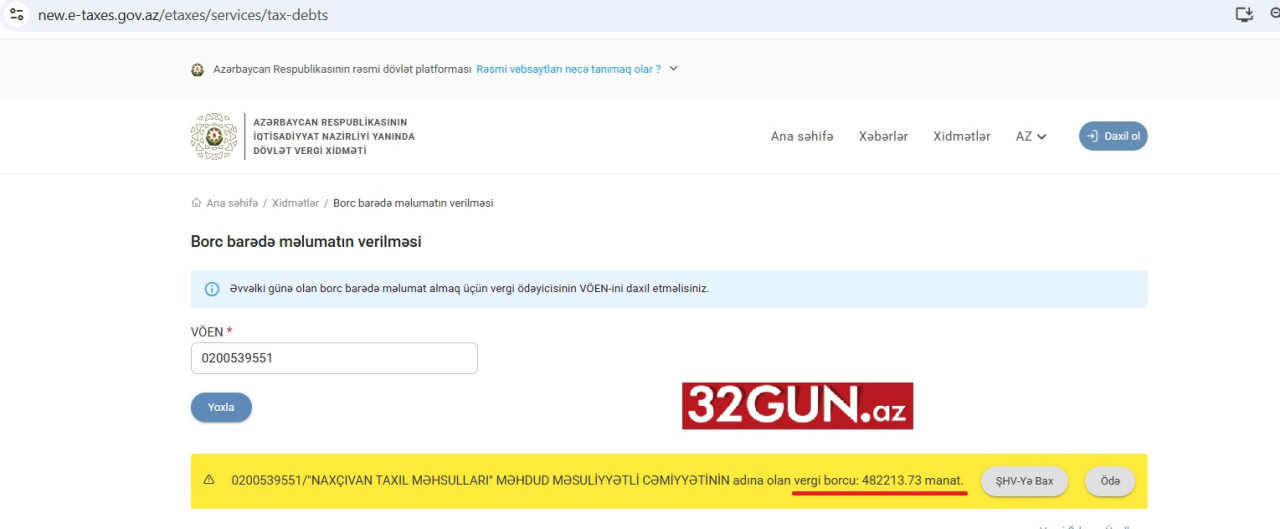 32gun.az-ın əldə etdiyi digər məlumata görə, “Naxçıvan Taxıl Məhsulları” MMC-nin hazırda dövlətə yarım milyon manata yaxın - dəqiq desək, 482 213.73 AZN məbləğində vergi borcu var.
